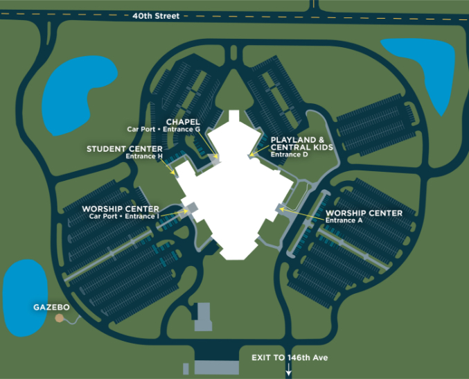 Worship Center – We recommend parking near our Worship Center East entrance, Entrance A, if you do not plan to have children participating in Central Kids. There, we have guest parking reserved for YOU! Entering through this entrance will take you directly to our main lobby.